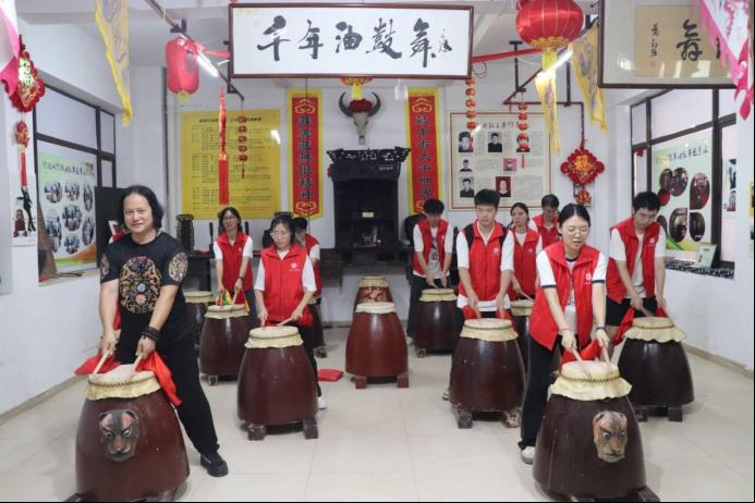 图为钱老师教实践团成员打油鼓画面。罗云菲摄