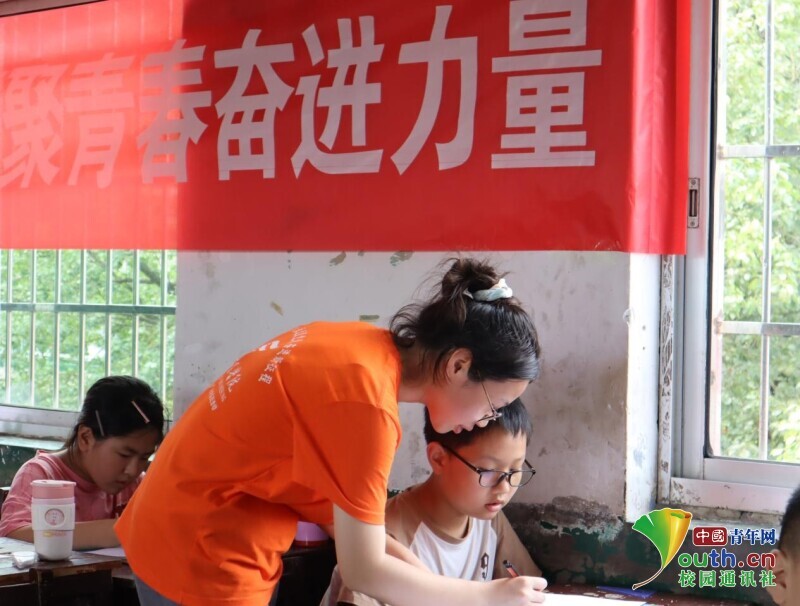 图为实践团成员一对一教小朋友解数学题。中国青年网通讯员 龚艳星 摄
