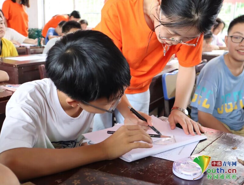 图为“妙绘中华 筑梦童心”主题绘画课上实践团成员一对一教小朋友们画画的样子。中国青年网通讯员 龚艳星 摄